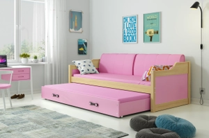Lit ado gigogne David 90X200 avec matelas et tiroir, pin/rose