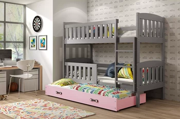 Lit ado superposé 3 places Jacquot 90X190 avec matelas et tiroir, gris/rose