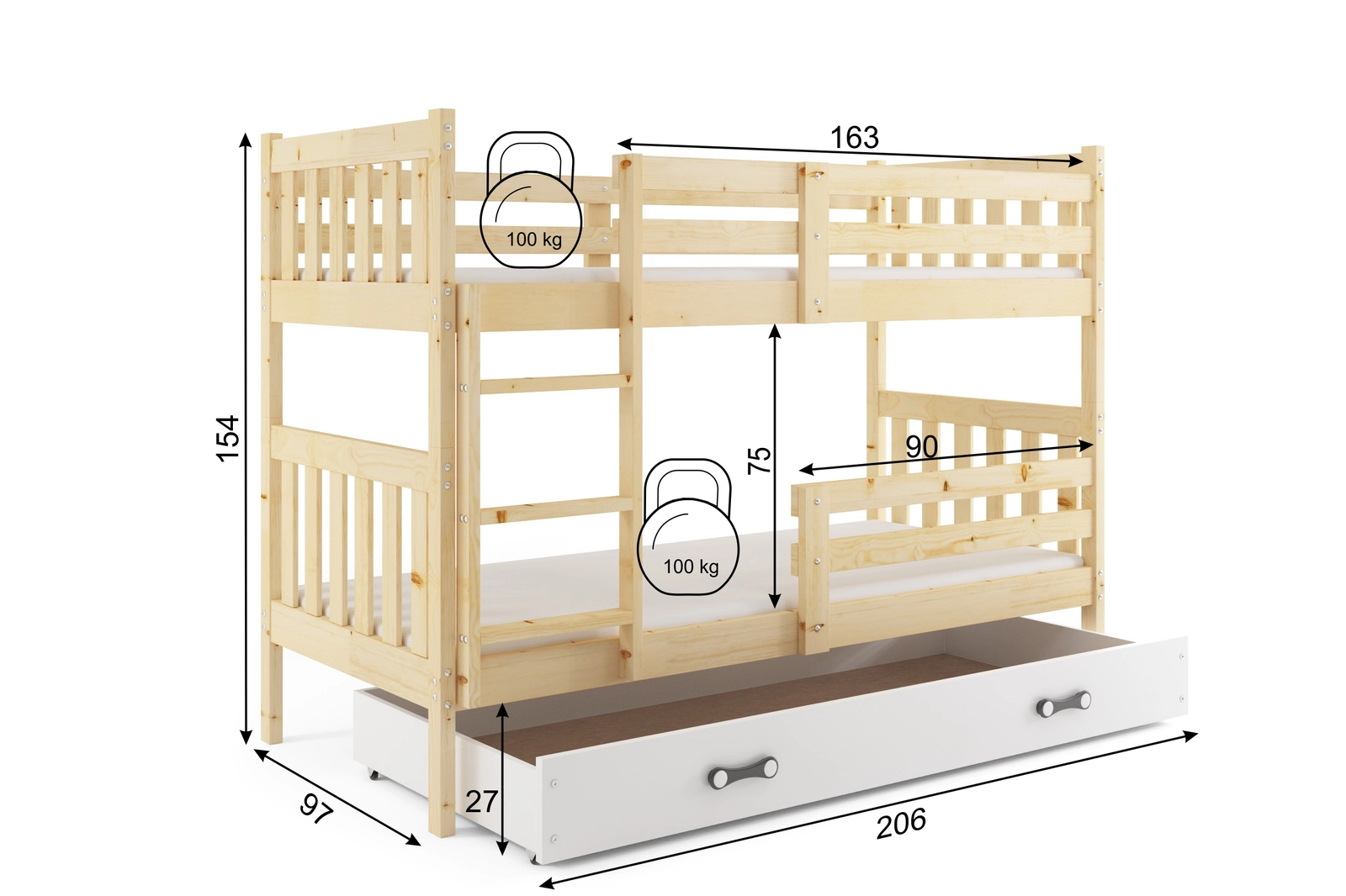 Lit ado superposé Gaspard 90X200 avec matelas et tiroir, bois naturel/blanc
