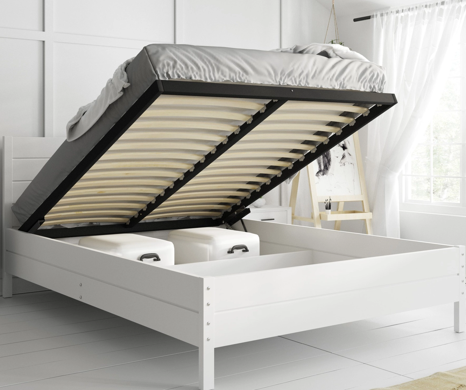 Coffre de rangement : sur toute la surface du lit, divisé par une cloison.
