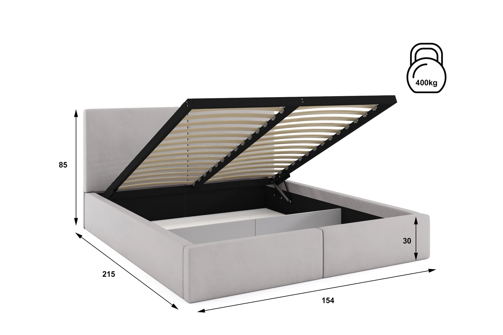 - Sous le sommier relevable, espace divisé par une cloison : pas de fond à l’arrière, coffre pour la literie à l’avant.