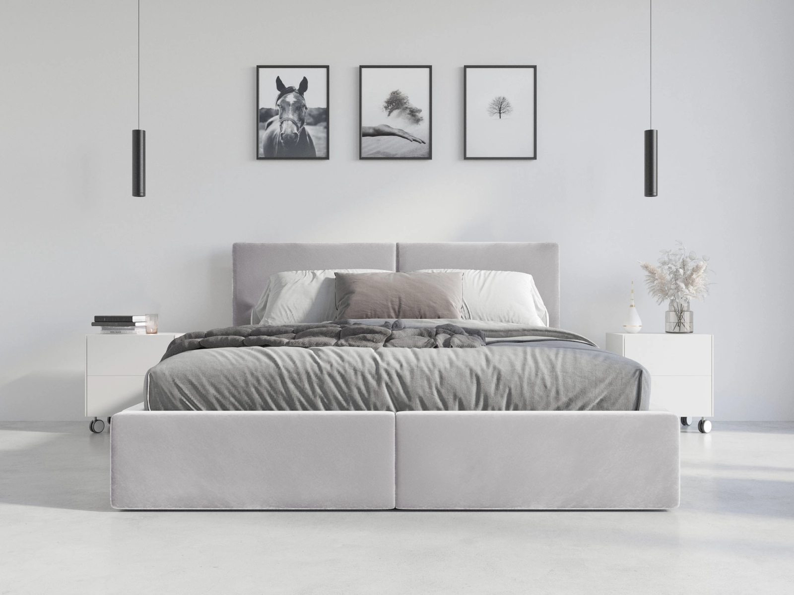 Le lit Hilton est un excellent choix pour les intérieurs de style moderne, minimaliste ou scandinave. Sa finition rembourrée de couleur gris cendré s'harmonisera parfaitement avec différents agencements, leur offrant un arrière-plan délicat. C'est également l'occasion de choisir des accessoires contrastés pour donner du caractère à votre intérieur.