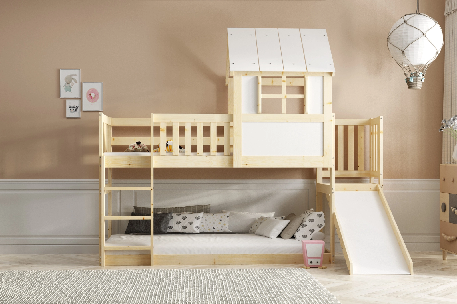 L’attraction principale de ce lit est bien sûr le toboggan, qui promet des heures de jeu sans fin. Ainsi, le lit mezzanine devient non seulement un espace de sommeil, mais également un petit centre de divertissement. Le lever quotidien devient un plaisir lorsque l’on peut descendre du lit en glissant le matin.
