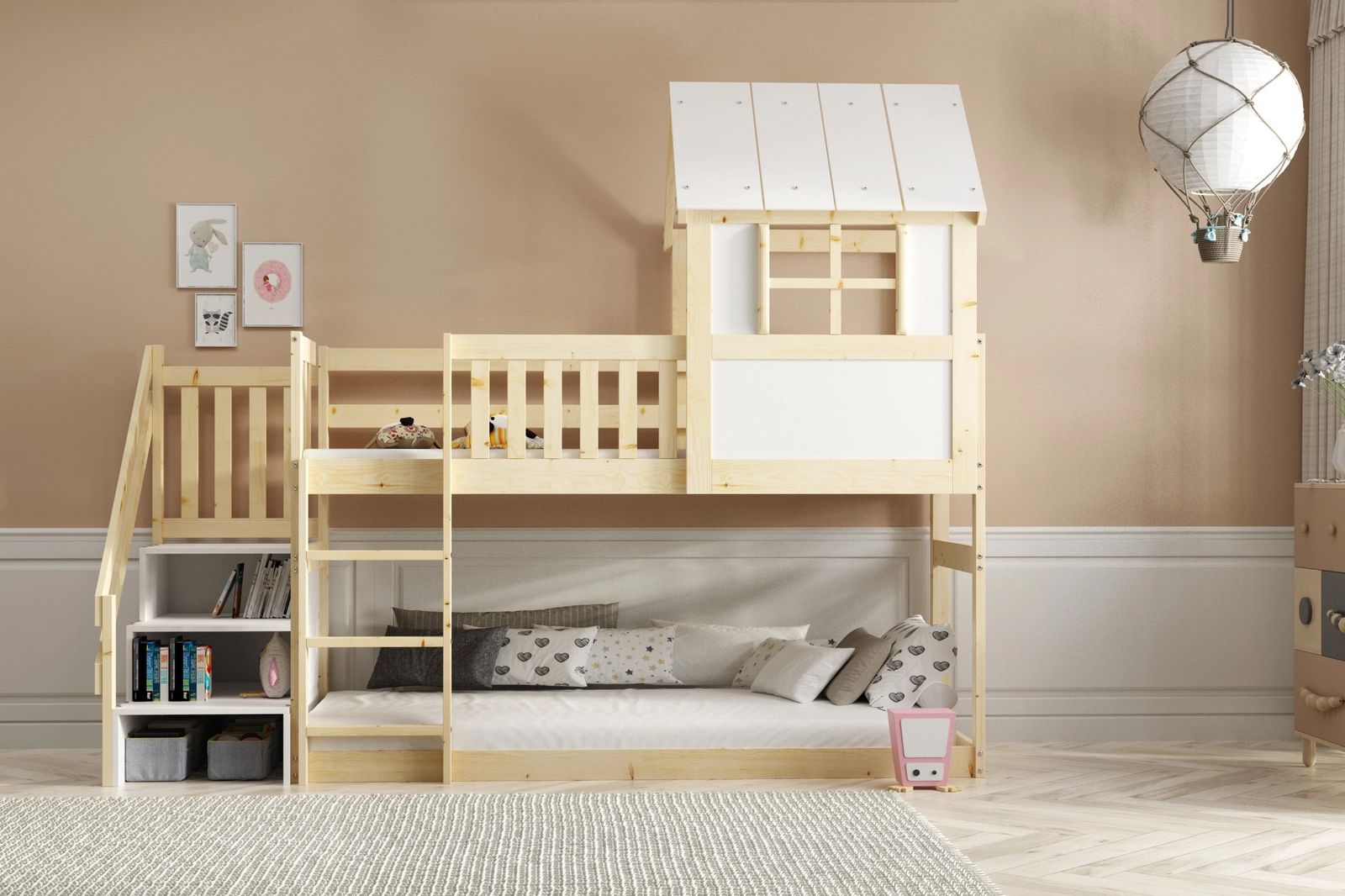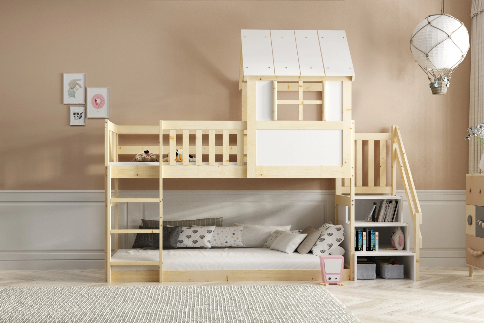 Escaliers pour le lit – accès pratique pour l’enfant, espace de rangement supplémentaire.
