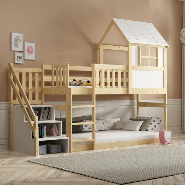- Le lit mezzanine cabane avec escaliers est la solution idéale pour une chambre d’enfant. Fabriqué en bois naturel. La surface de couchage de 90x200 cm et la couleur blanche des façades créent un espace harmonieux pour votre enfant.