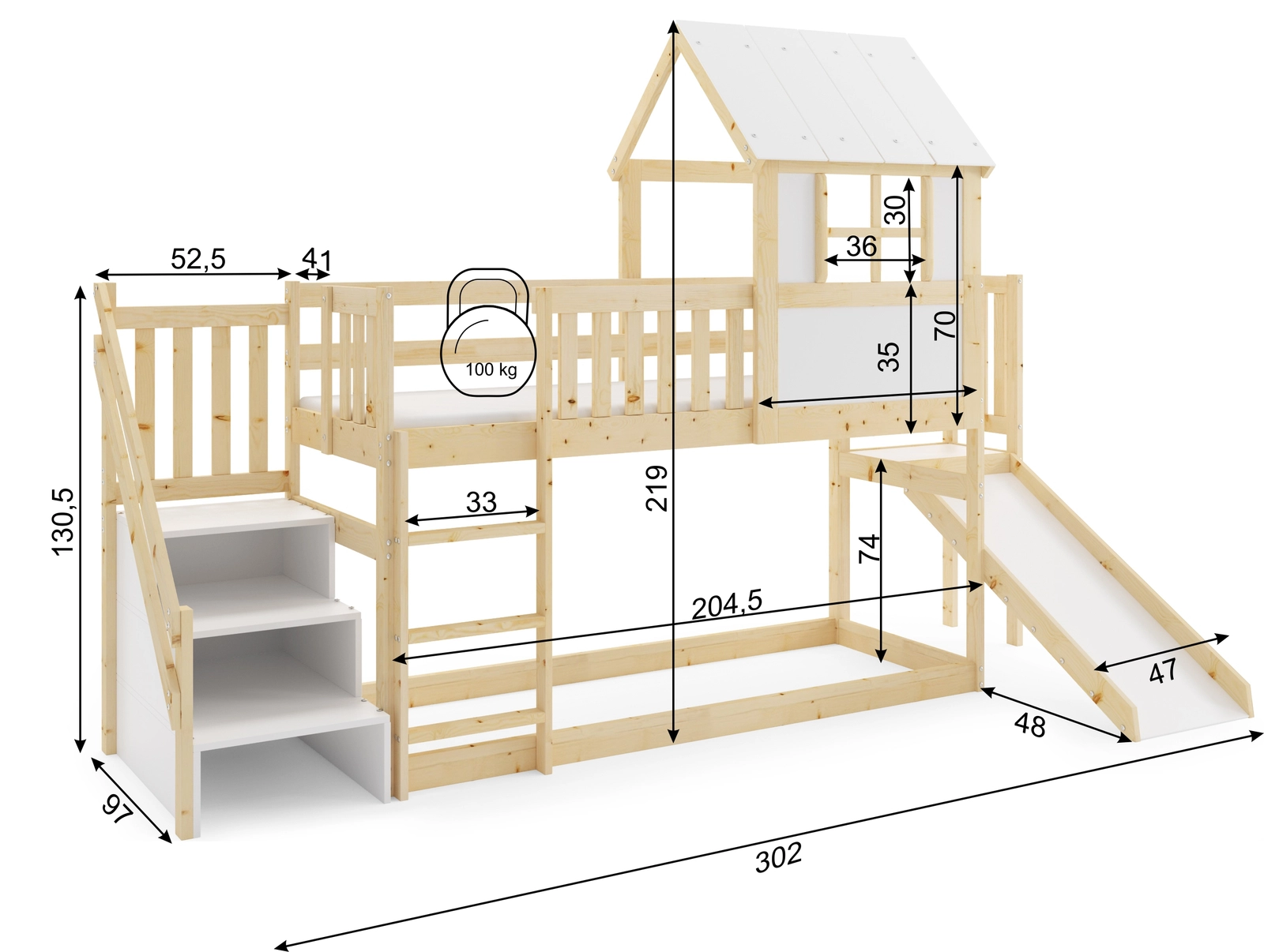 - Le lit mezzanine cabane avec toboggan et escaliers est la solution idéale pour les enfants, combinant amusement et fonctionnalité. Réalisé en bois de couleur naturelle avec des façades blanches. La surface de couchage de 90x200 cm garantit confort .