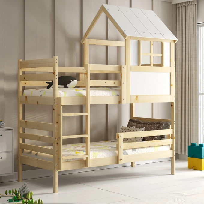 - Le lit mezzanine en forme de maison est le choix idéal pour les adolescents. Fabriqué en bois naturel avec des façades blanches, il offre un espace de couchage de 90x190 cm ainsi qu’un couchage supplémentaire.