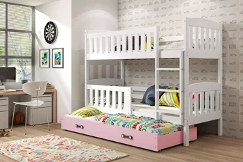 Lit ado superposé 3 places Jacquot 90X190 avec matelas et tiroir, blanc/rose