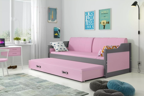 Lit ado gigogne David 90X200 avec matelas et tiroir, gris/rose