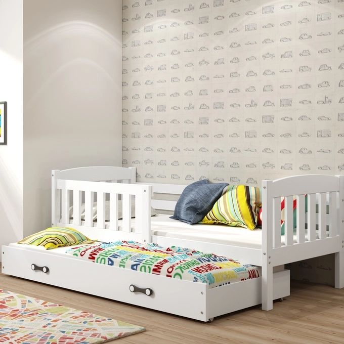 Stable et solide grâce a la construction en pin massif, il résistera non seulement au sommeil, mais aussi a presque tous les jeux des enfants de plusieurs années. Une barriere supplémentaire protege l’enfant sur le couchage supérieur, grâce a quoi cette partie conviendra a un enfant plus jeune. Le grand trésor gagne alors un espace spacieux et extremement confortable sur le tiroir coulissant. Les deux endroits sont tout aussi confortables et surs. Ils sont équipés d'un sommier flexible composé de lattes en bois, ce qui augmente le confort du sommeil et facilite la position correcte, grâce a laquelle la structure protege la colonne vertébrale. C'est un investissement dans leur santé maintenant et dans l'avenir.
