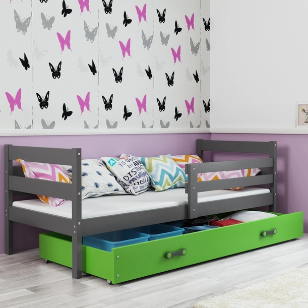 Lit ado simple Éric 90X190 avec matelas et tiroir, gris/vert