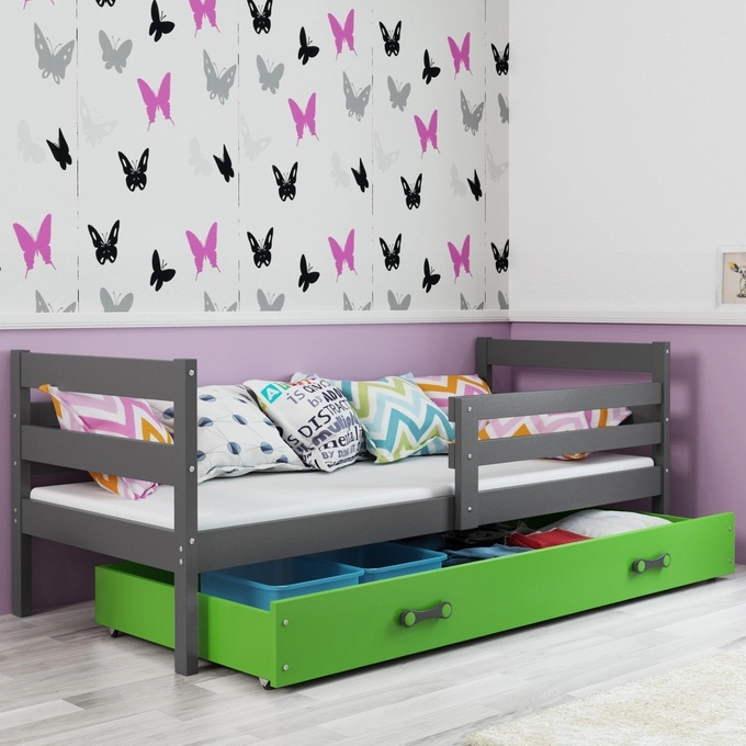 Lors de la commande, vous pouvez spécifier la couleur du cadre. Si vous n'etes pas intéressé par un lit d’ados blanc, vous pouvez choisir du gris ou une teinte naturelle de pin. Nous avons obtenu la couleur grise du cadre en peignant la surface du bois avec une peinture totalement sure et anti-allergique, ce qui rend le produit sans danger meme pour les enfants a la peau sensible. La couleur sombre plaira particulierement aux garçons, mais avec le bon design d'intérieur, les filles l'aimeront aussi. La taille de 190x90 cm en fait un investissement pour des années. Parfait pour une chambre d'enfant de 3 ans ou 7 ans. Le lit d'adolescent est équipé d'un tiroir. Il est disponible en gris, blanc, vert, bleu et rose. Le tiroir vert est suffisamment spacieux pour pouvoir facilement contenir, par exemple, des vetements, de la literie et des articles rarement utilisés. La présence de roulettes aide a le sortir facilement. Vous pouvez acheter un matelas pour le lit, qui est également un bon choix pour les personnes allergiques. Il est doté d'une fibre de climatisation et d'une housse en tissu hypoallergénique. Ce lit d'adolescent est également tres rapide et facile a monter.