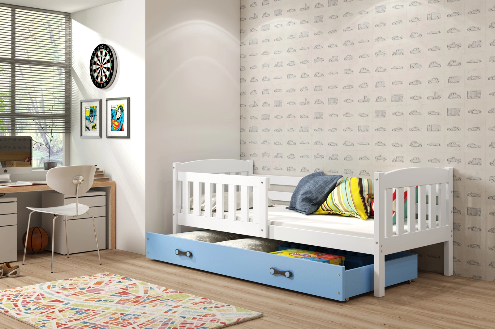 Lit ado simple Jacquot 90X190 avec matelas et tiroir, blanc/bleu