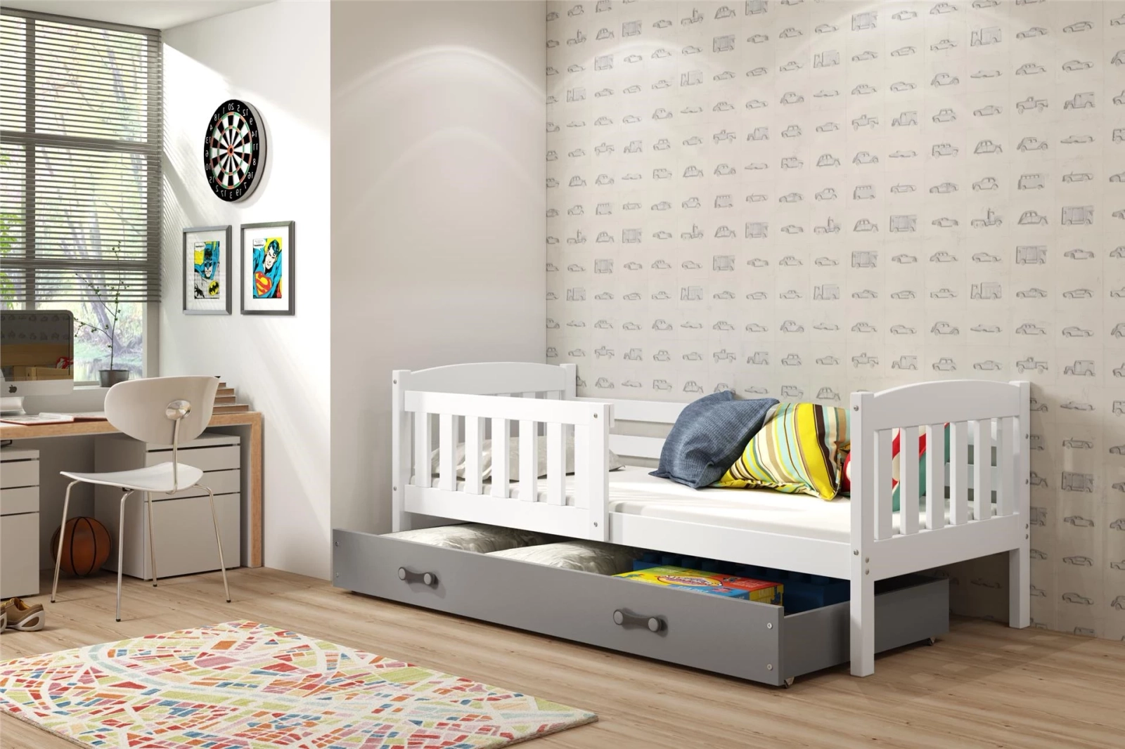 Lit ado simple Jacquot 90X190 avec matelas et tiroir, blanc/gris
