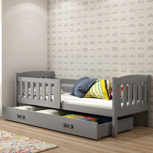 Le lit superposé Kubus a un design moderne et le cadre arrondi lui donne un aspect léger et presque doux. La taille du lit 90x200 est une solution extremement confortable. Fournit un grand espace de couchage. Cela en fait également un investissement pour des années - confortable a la fois pour un enfant de 5 ans et un adolescent. La couleur grise du cadre est universelle. Il associe des formes simples et minimalistes qui donnent de la légereté a l'ensemble de la chambre. Grâce a cela, le lit, malgré sa taille, ne submerge pas l'intérieur. Le tiroir de couleur grise dans la partie inférieure peut etre utilisé comme endroit pour la literie ou comme rangement supplémentaire pour les jouets. Une solution pratique qui vous plaira avant tout si vous aimez de l’ordre. Les poignées design se démarquent subtilement. En choisissant un lit superposé Kubus, vous obtenez tout ce qui est le plus important : vous augmentez la sécurité de votre enfant, augmentez la fonctionnalité de la chambre et assurez un sommeil paisible.