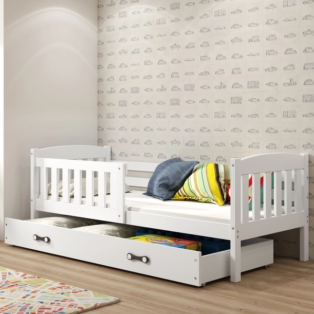 Le lit superposé Kubus a un design moderne et le cadre arrondi lui donne un aspect léger et presque doux. La taille du lit 90x200 est une solution extremement confortable. Fournit un grand espace de couchage. Cela en fait également un investissement pour des années - confortable a la fois pour un enfant de 5 ans et un adolescent. La couleur blanche du cadre est universelle. Il associe des formes simples et minimalistes qui donnent de la légereté a l'ensemble du projet. Grâce a cela, le lit, malgré sa taille, ne submerge pas l'intérieur. Le tiroir blanc en partie basse peut servir d’endroit pour la literie ou de rangement supplémentaire pour les jouets. Une solution pratique qui vous plaira avant tout si vous aimez de l’ordre. Les poignées design se démarquent subtilement. En choisissant un lit superposé Kubus, vous obtenez tout ce qui est le plus important : vous augmentez la sécurité de votre enfant, augmentez la fonctionnalité de la chambre et assurez un sommeil paisible.