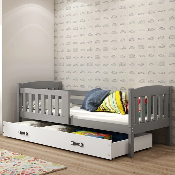Le lit superposé Kubus a un design moderne et le cadre arrondi lui donne un aspect léger et presque doux. La taille du lit 90x200 est une solution extremement confortable. Fournit un grand espace de couchage. Cela en fait également un investissement pour des années - confortable a la fois pour un enfant de 5 ans et un adolescent. La couleur grise du cadre est universelle. Il associe des formes simples et minimalistes qui donnent de la légereté a l'ensemble de la chambre. Grâce a cela, le lit, malgré sa taille, ne submerge pas l'intérieur. Le tiroir blanc en partie basse peut servir d’endroit pour la literie ou de rangement supplémentaire pour les jouets. Une solution pratique qui vous plaira avant tout si vous aimez de l’ordre. Les poignées design se démarquent subtilement. En choisissant un lit superposé Kubus, vous obtenez tout ce qui est le plus important : vous augmentez la sécurité de votre enfant, augmentez la fonctionnalité de la chambre et assurez un sommeil paisible.
