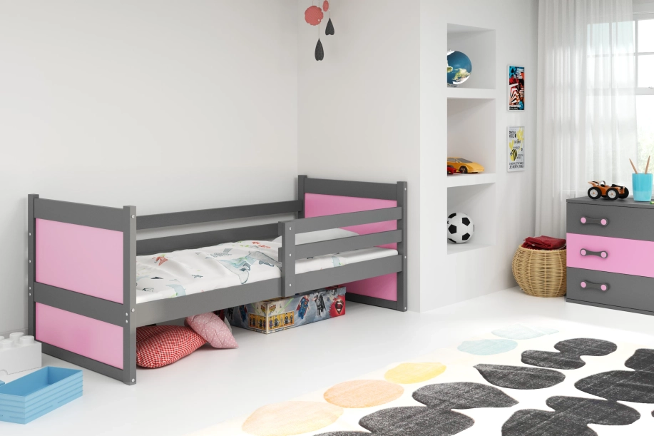 Le lit enfant modele RICO est une solution tres fonctionnelle pour une chambre de garçon et de fille. L'ensemble se distingue par un design minimaliste, grâce auquel il s'integre parfaitement a tous les éléments du décor. Les couleurs universelles facilitent l'association a divers arrangements. Un lit peint en couleur graphite est une solution intense et neutre a la fois, et la disposition finale dépend des autres éléments - la couleur des murs et des accessoires. La peinture recouvrant la structure est anti-allergique et possede toutes les approbations nécessaires.