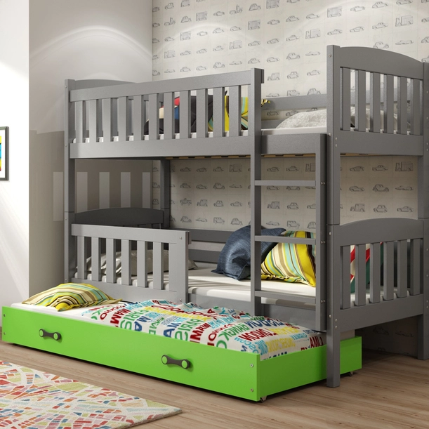 Lit ado superposé 3 places Jacquot 90X200 avec matelas et tiroir, gris/vert