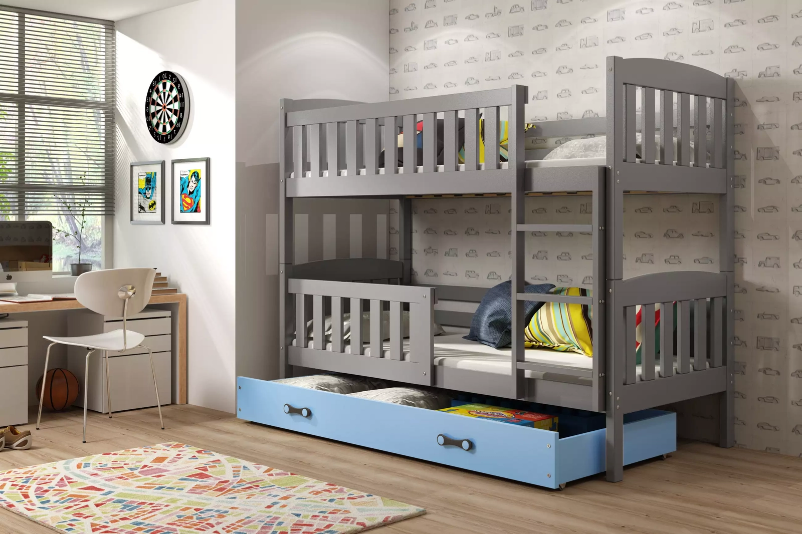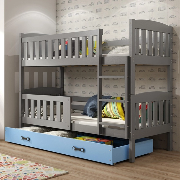 La structure a deux étages permet une utilisation optimale de l'espace, grâce a laquelle il y a plus d'endroits pour jouer ou étudier. La construction en bois de pin massif et renforcée avec des vis en acier de haute qualité est stable et durable. Ceci, a son tour, signifie la sécurité de vos enfants pendant le sommeil et votre repos paisible. Possibilité d'installer des barrieres des deux côtés pour donner plus de sécurité est le résultat de prendre soin d'eux. Ils protegent meme les enfants les plus mobiles et les plus énergiques contre les chutes. Le sommier composé de lattes flex en bois offre un excellent support pour la colonne vertébrale. La taille de 90x190 cm en fait un investissement pour des années. C'était parfait pour une chambre d'enfant de 3 ans et une chambre d'adolescent. Nous avons obtenu la couleur grise en peignant la teinture du bois avec une peinture totalement sure et anti-allergique, ce qui rend le produit sans danger meme pour les enfants a la peau sensible. Une option neutre pour les garçons et les filles, qui vous permettra d’etre tranquille avec vos petits. Le lit est équipé d'un tiroir multifonctionnel sur roulettes, qui sera une place supplémentaire pour la literie, un accessoire ou un rangement supplémentaire des livres. La solution parfaite qui vous permettra de garder de l'espace et de garder l'ordre que vous manquez probablement le plus vous-meme. Le tiroir bleu donne un caractere de garçon. Poignées design décorent la construction. La structure arrondie donne l'impression d'etre plus légere, grâce a quoi elle ne submerge pas l'intérieur malgré sa taille.