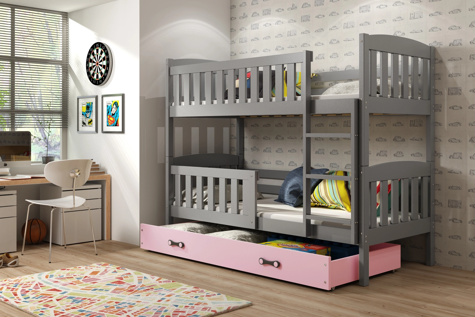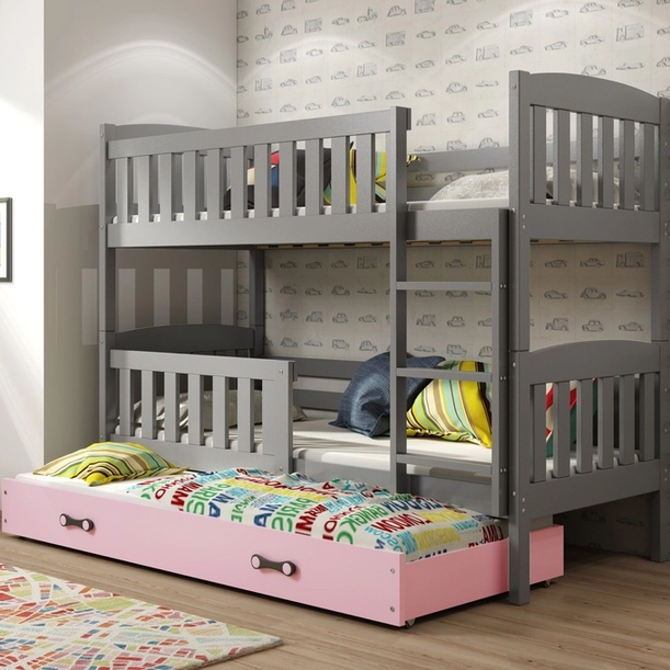 LIT ADOLESCENT SUPERPOSÉ 3 PLACES KUBUS LE CADRE EN GRIS LE TIROIR EN ROSE SANS MATELAS 90 X 200