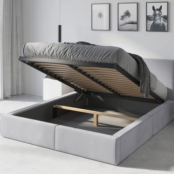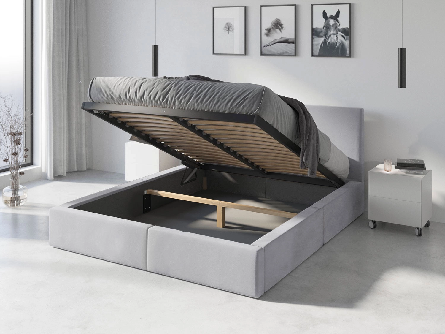 Lit double rembourré Le Hilton 140X200 avec matelas et coffre, gris clair