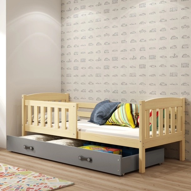 Lit enfant simple Jacquot 80X160 avec matelas et tiroir, pin/gris