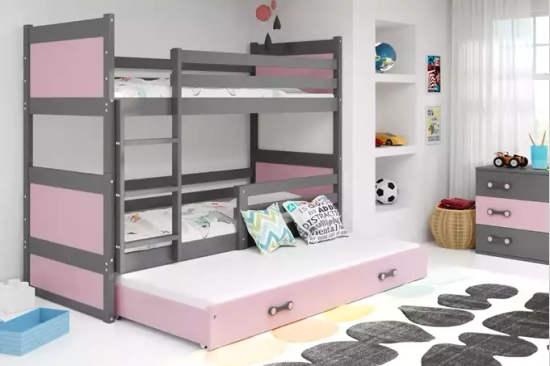 Lit ado superposé 3 places Rico 90X190 avec matelas et tiroir, gris/rose