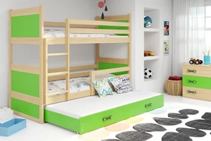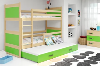 Lit ado superposé 3 places Rico 90X200 avec matelas et tiroir, pin/vert