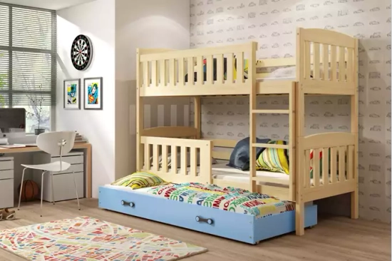 Lit ado superposé 3 places Jacquot 90X190 avec matelas et tiroir, pin/bleu
